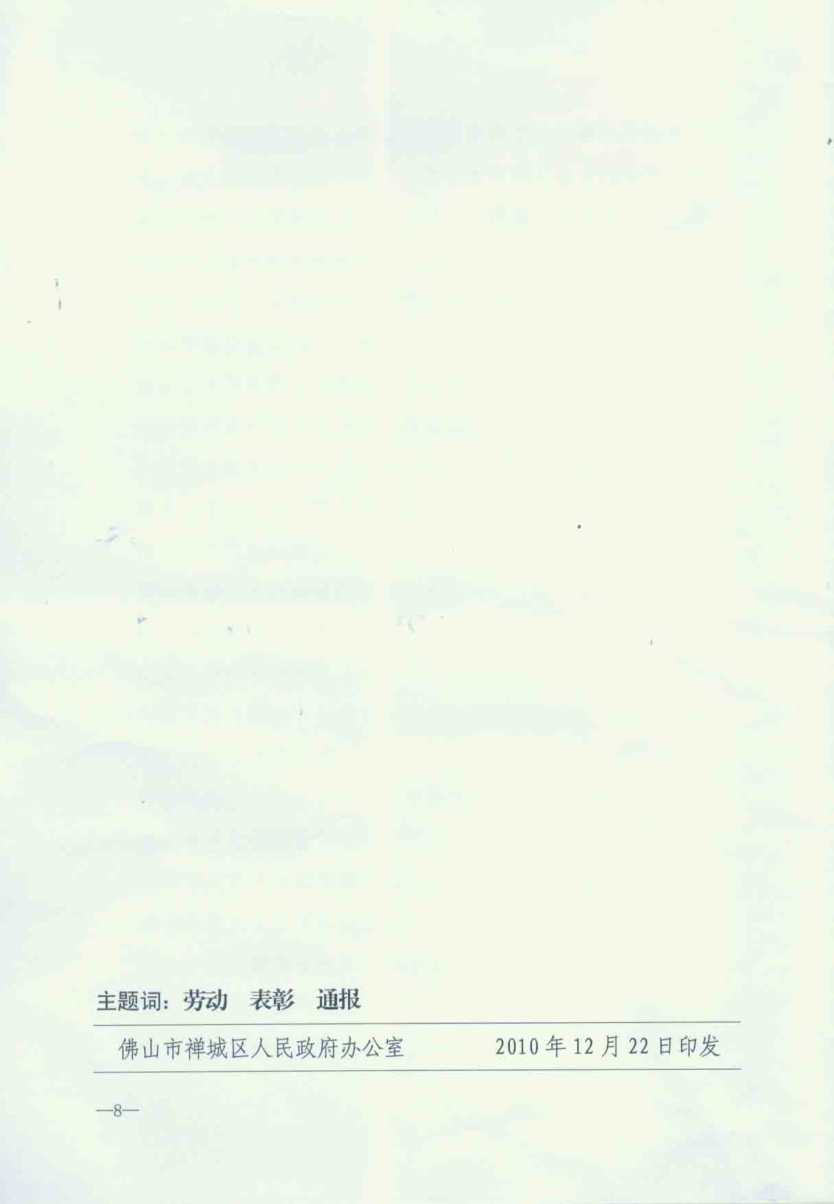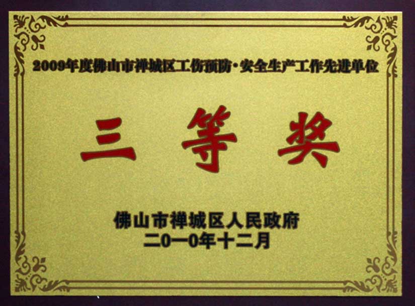 我公司榮獲2009年度佛山市禪城區(qū)工傷預防·安全生產工作先進單位“三等獎”。