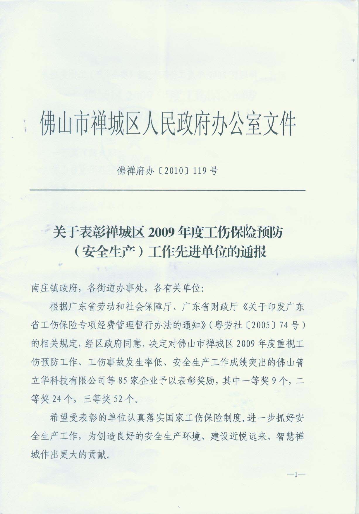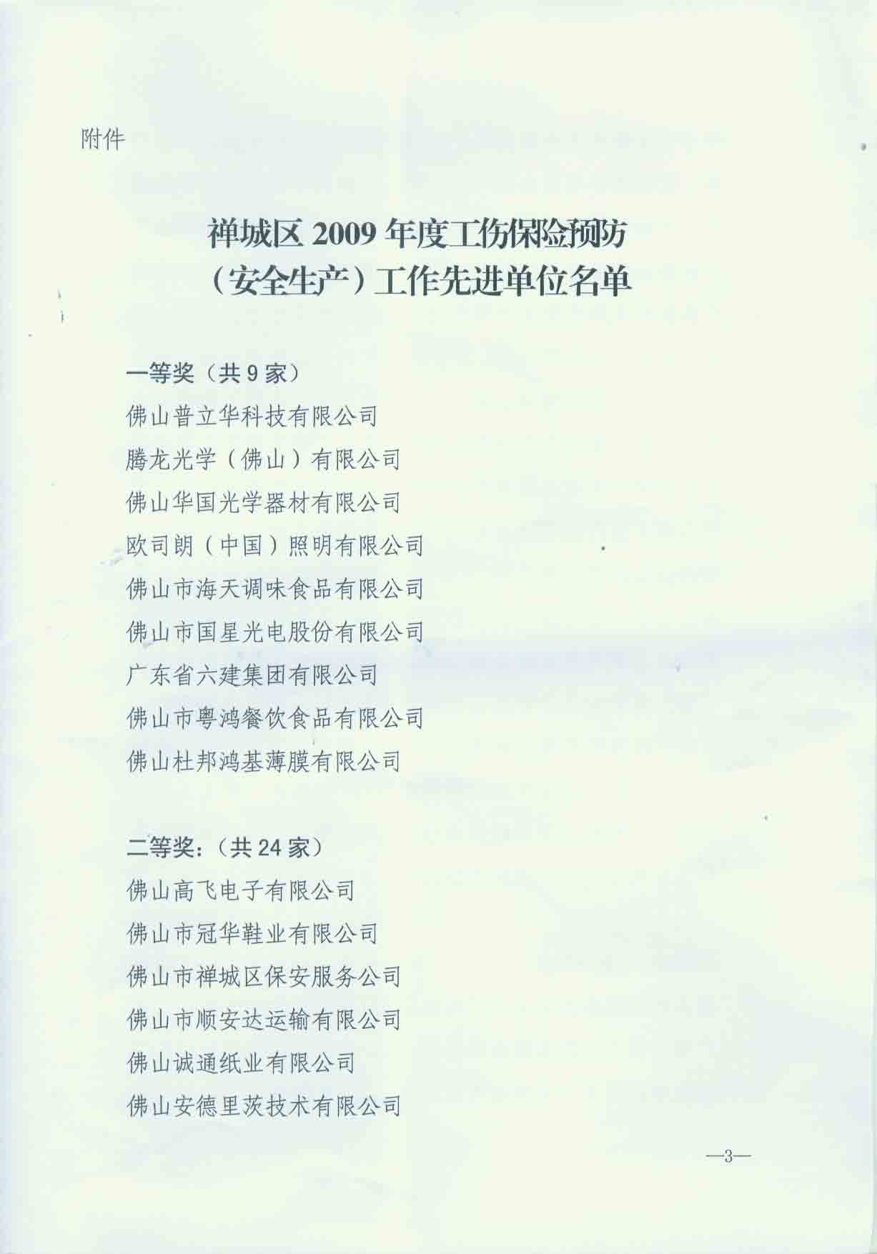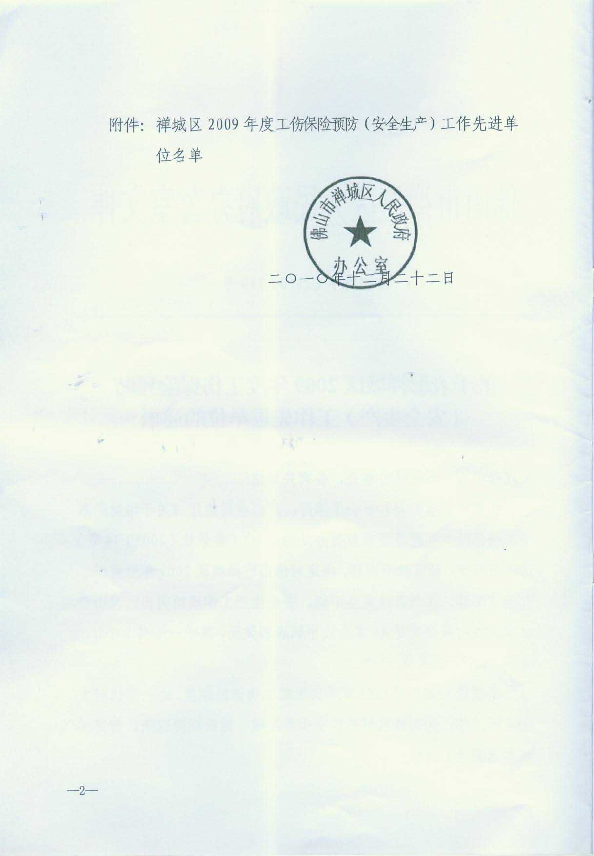 我公司榮獲2009年度佛山市禪城區(qū)工傷預防·安全生產工作先進單位“三等獎”